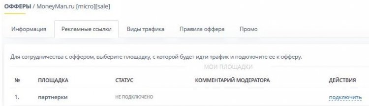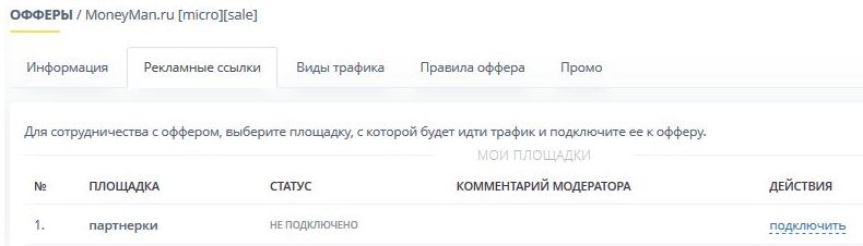 Для добавления источника трафика, с которым намереваетесь работать, надо перейти в пункт меню «Мои площадки».