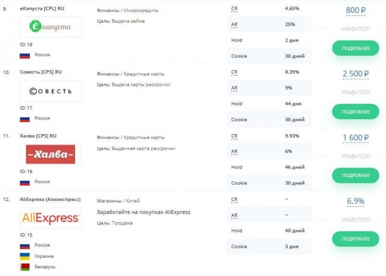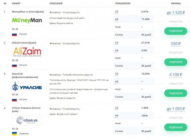 Сама финансовая партнерка работает с весны этого года, в ассортименте имея предложения по следующим нишам.