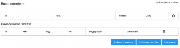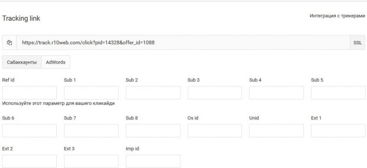 Описание – стандартное: информация по рейтам, виды трафика, география и цели. Там же настраиваются постбэки и субаккаунты.