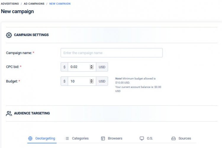 Минимальная стоимость клика – $0.005 USD.