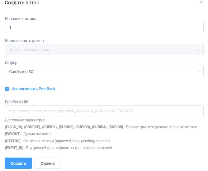 Создаете поток, прописываете постбэки и получаете ссылку. Это и вся настройка.