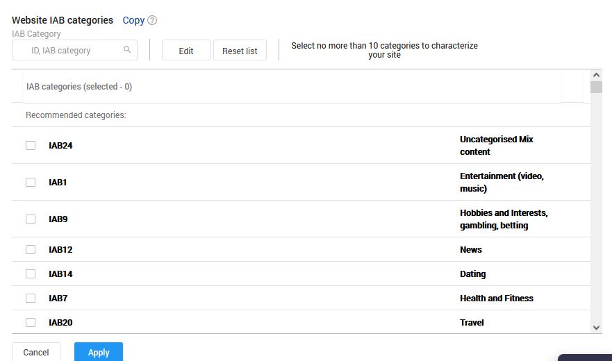 Свою категорию сайта – до 10 пунктов, чтобы показывалась релевантная реклама.