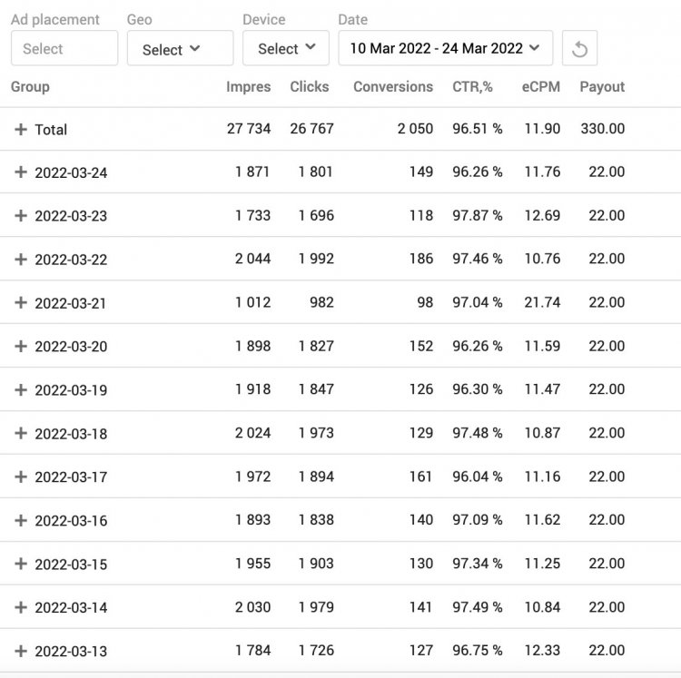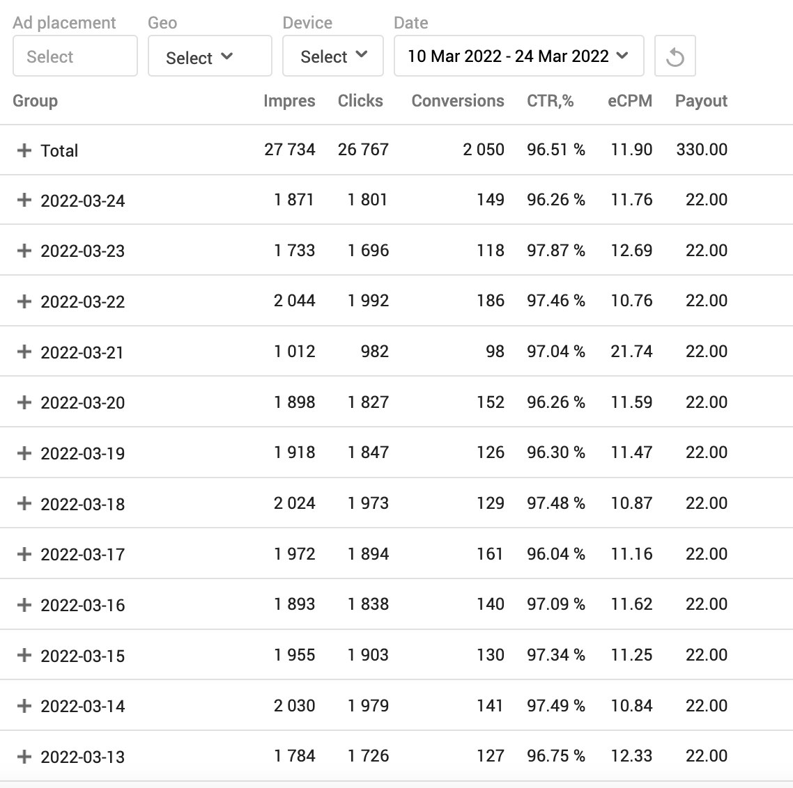 Как и в примере выше, настройку и запуск лучше проводить через своего менеджера, который даст советы по оптимизации. Поскольку именно он помогает подобрать рекламодателей, исходя их вашей статистики гео. Если вы обговорили особенности работы при запуске, то они будут сохранены и далее.