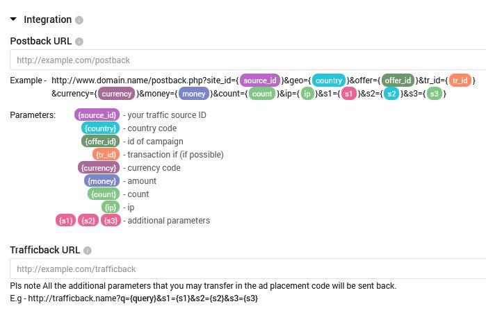 При необходимости прописываете постбэки и указываете ссылку для слива трафикбэка.