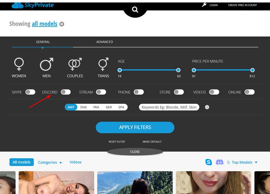 Теперь у вас есть опция фильтрации на SkyPrivate, которая позволяет вам продвигать исключительно тех моделей, которые предлагают приватные шоу на Discord (Дискорд).