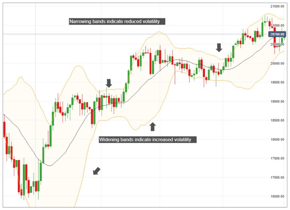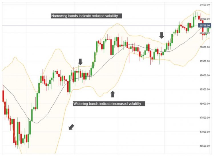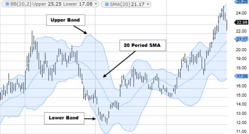 Созданный Джоном Боллинджером, индекс использует три линии (или полосы) для отображения скользящей средней наряду с положительными и отрицательными отклонениями.