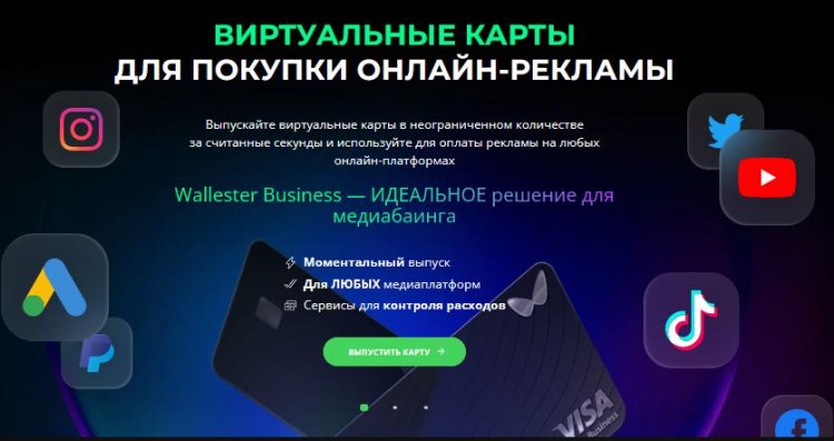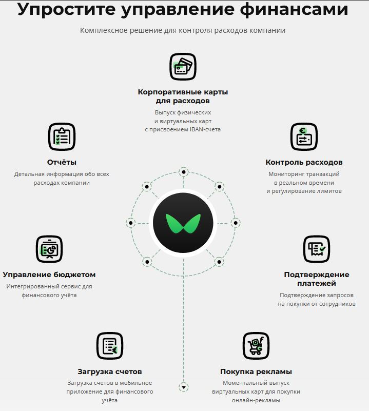• Медиабаинг - мгновенный выпуск виртуальных карт для покупки онлайн-рекламы и арбитража трафика;