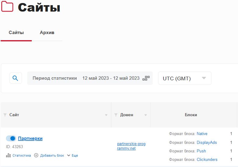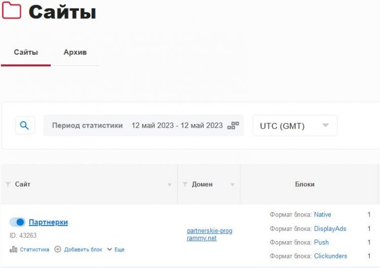 Потом свои сайты и статистику по ним можно будет просмотреть по параметрам:
