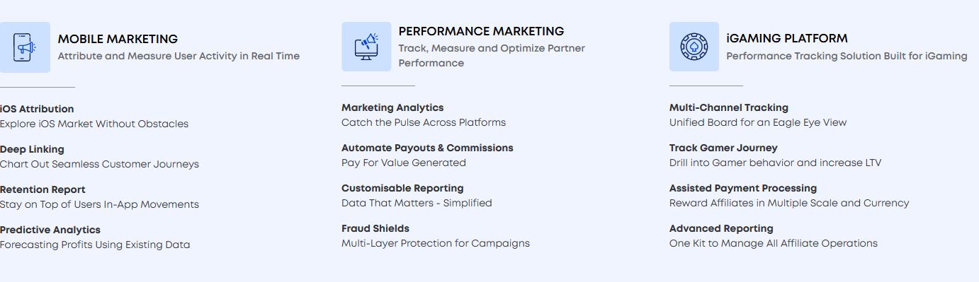 • IGaming - комплексное решение, разработанное специально для индустрии гемблинга, форекс и лотерей для многоканального отслеживания.