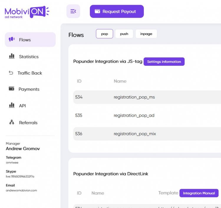 Купить трафик для арбитража и заработать сайтах с адалт и мейнстрим контентом теперь еще можно и на бирже Mobivion. Актуальные рекламные форматы на момент обзора: попандер, пуш уведомления и in-page pushes через интеграции JS-tag, директлинки и JSON/XML feed.