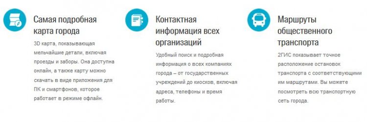 2ГИС представляет собой безоплатный справочник с автомобильными маршрутами, в том числе общественного транспорта, списком предприятий, полноценной подробной картой более чем 1000 городов в 12 странах мира. Основной является Россия.