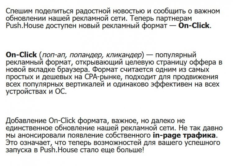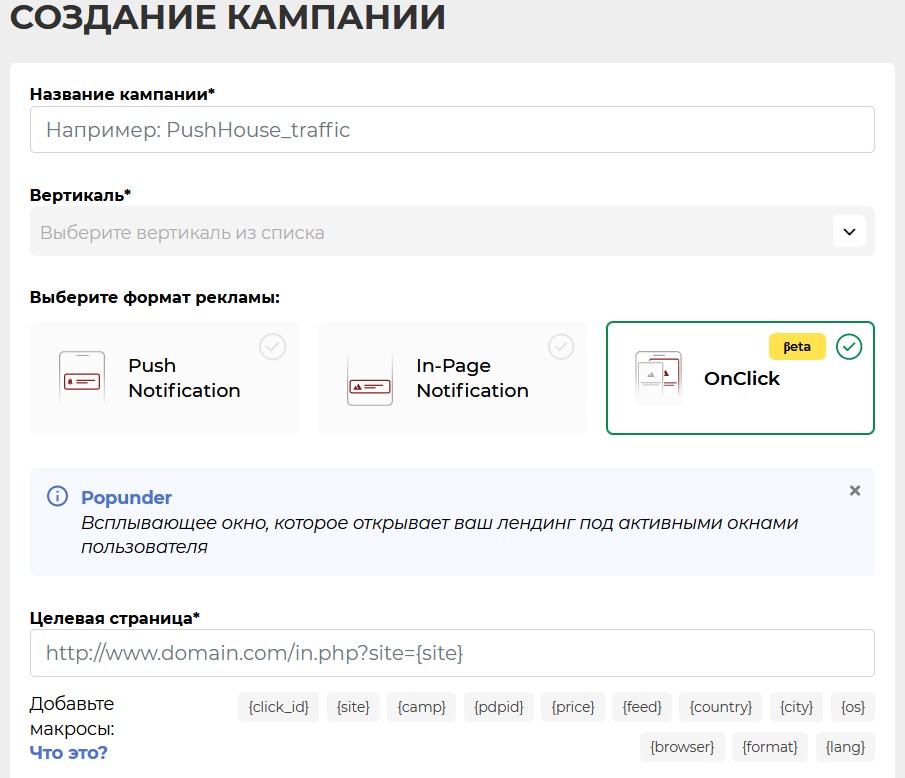 Биржа трафика Push House запустила новый формат onclick, он же - попандер. Теперь купить попандер можно в соответствующей кампании, а доступные объемы по разным странам посмотреть в меню.