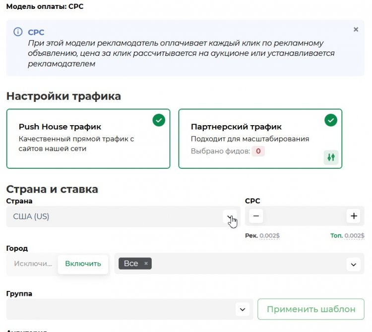 Можно закупаться - на выбор - только чистым трафиком самой системы. Или закупаться дополнительно и у партнеров Пуш Хауса.