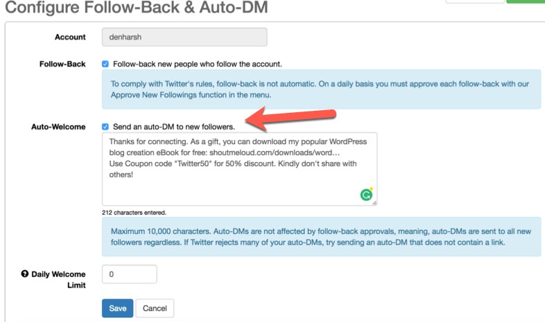 Вот шаги, которые необходимо выполнить, чтобы настроить автоматическую рассылку сообщений Twitter DM через SocialOomph.