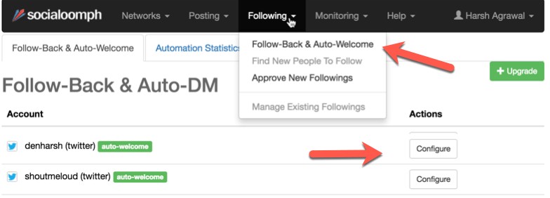 Как только вы окажетесь на приборной панели SocialOomph, нажмите на Following > Follow-Back & Auto-Welcome.