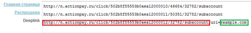 Ваш deeplink выделен красным. Ссылка страницы товара, которую можно добавить на сайт – зеленым(после знака равенства). Переходя по ней, пользователь перейдет в партнерскую программу агрегатора интернет магазинов ActionPay, где фиксируется переход, после чего на сайт интернет-магазина.
