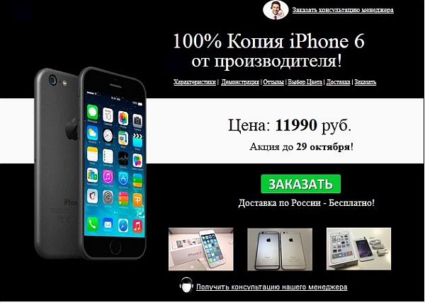 Цена копии айфона 6 составляет 11990 рублей. Отчисление для вебмастера – 1000 рублей.