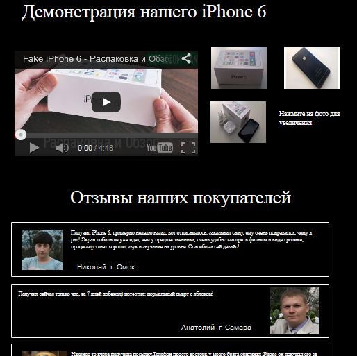 Вот так выглядит лендинг, куда будут приходить ваши покупатели. Верхняя часть и нижняя с отзывами, демонстрацией возможностей и техническим описанием.