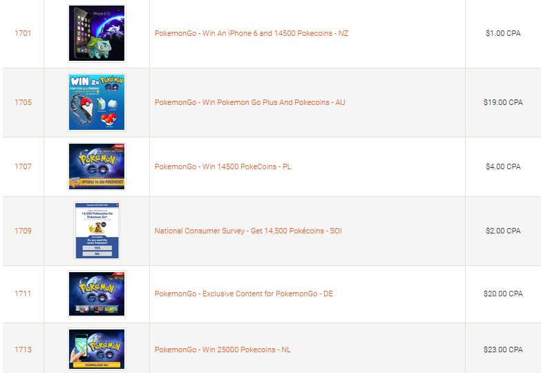 Ставки отличаются по разным странам, а партнерские программы уже запускают среди своих предложений новую игру с дополненной реальностью – охота за карманными монстрами с помощью приложения на телефоне. Это топовый оффер во всех мобильных партнерках по монетизации зарубежного трафика на данный момент.