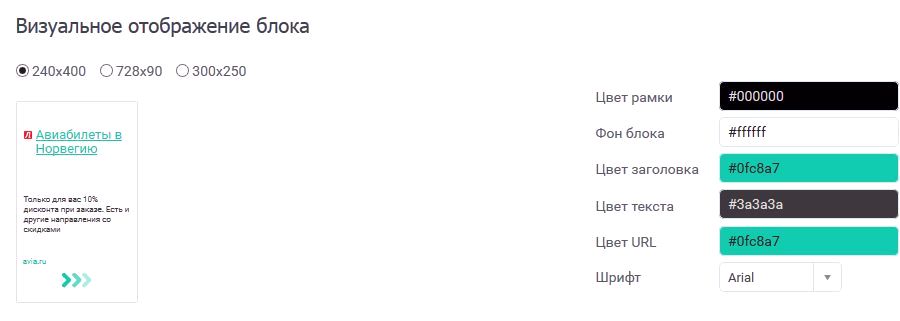 После быстрой автоматической проверки появляется окно, где можно настроить рекламный блок с одним из трех размеров и желаемым графическим дизайном.