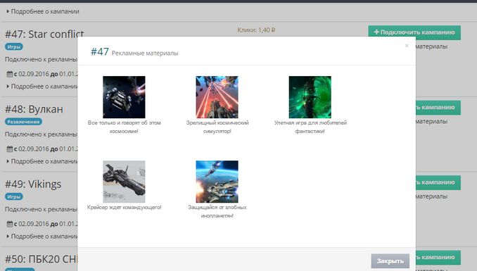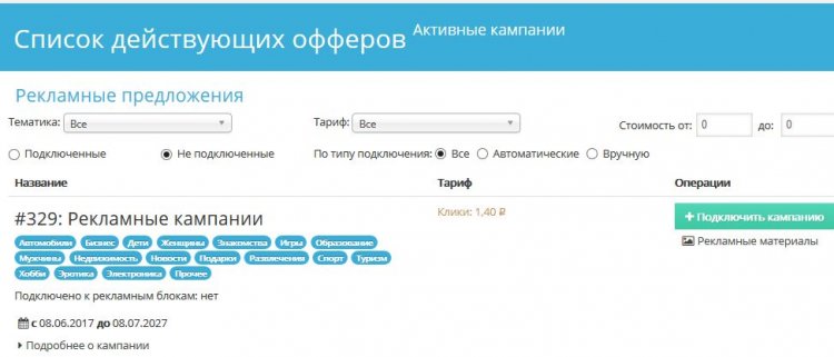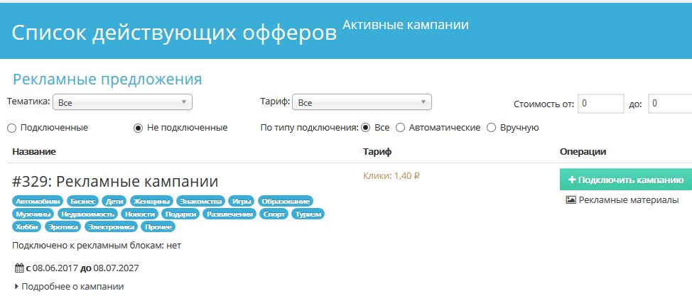 Затем выбираете одну из рекламных кампаний согласно необходимой тематике. То есть вы сами выбираете то, что потенциально сможет принести доход, и полностью контролируете содержимое рекламных кампаний.