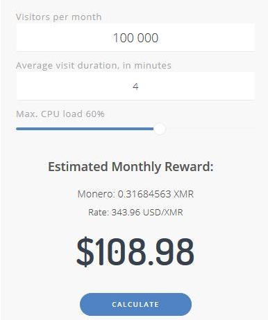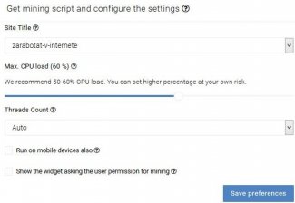 Оценить потенциальный заработок можно при помощи калькулятора на главной странице партнерской программы майнинга Mineralt. Задаете месячную посещаемость вашего сайта и величину среднего времени нахождения пользователей (можно взять статистику яндекса) и указываете загрузку процессора (рекомендуемый диапазон 50-60%).