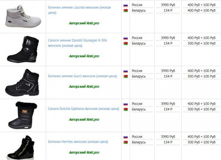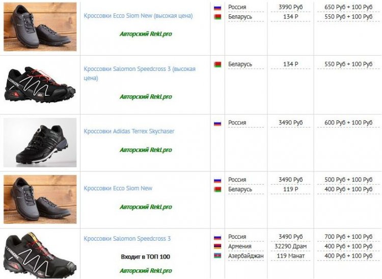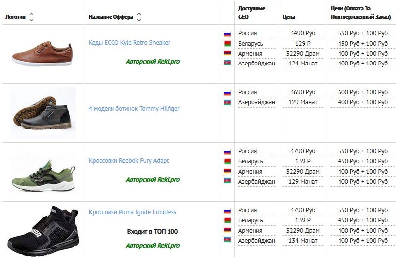 На такие офферы можно смело лить траф из соцсетей и тизерок, поскольку и уровень конкуренции ниже (соответственно, и оплата за клик), а также постоянная востребованность товара как такового. Плюс этого в том, что это раскрученные бренды, которые находятся «на слуху»: Salomon, Ecco, Timberland и так далее.