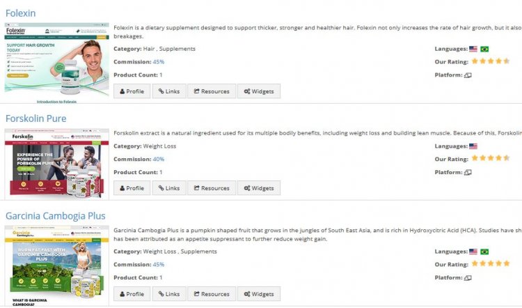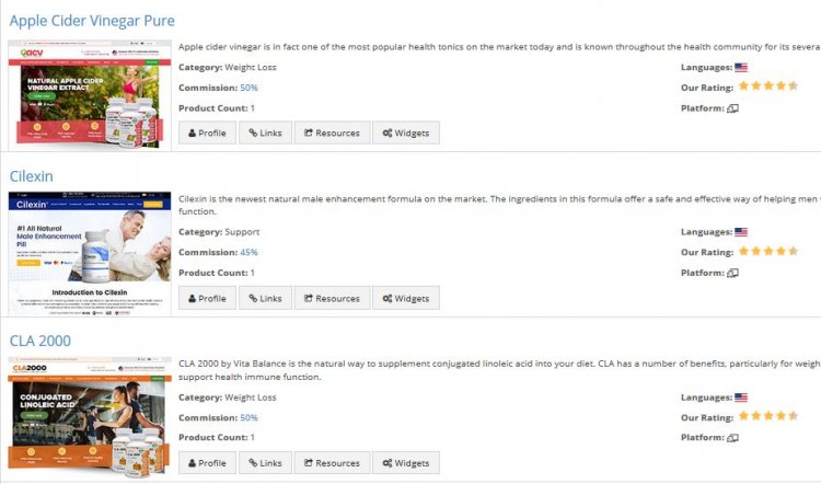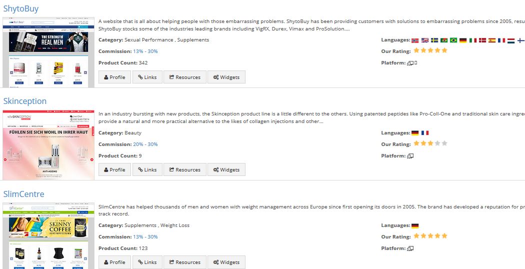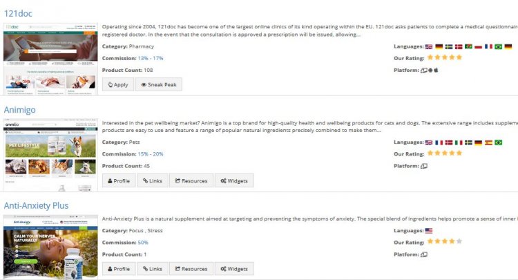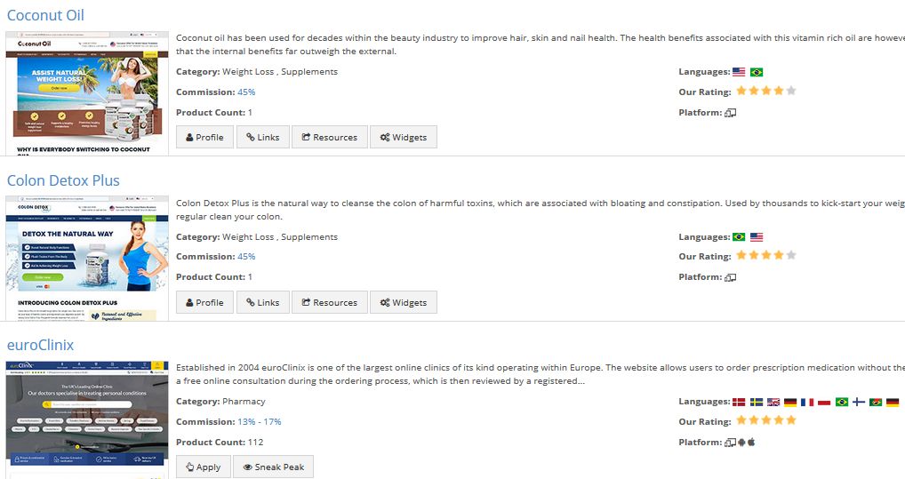 Ниже я сделал скриншоты некоторых предложений товарной партнерской программы для буржунета HealthTrader, что доступно на момент написания обзора партнерки. При этом обращайте внимание на количество продуктов, указанном в пункте «Product Count» – от 1 до 342.