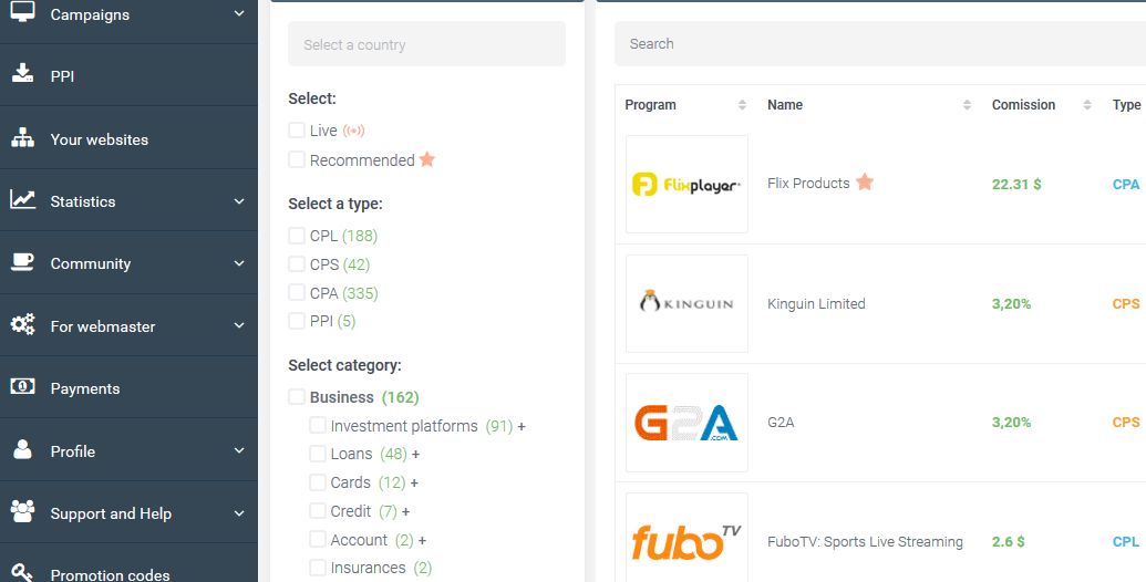 Работать в админке очень просто. Все пункты находятся на своих местах. Отдельно вынесены PPI офферы (с оплатой за инсталлы). Их же можно найти и в общем перечне.