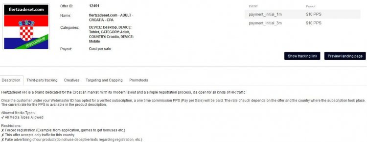Открывая любой оффер партнерской программы знакомств от прямого рекла Online Dating Kings, видим несколько вкладок. В первой из них идет описание и список источников трафика, разрешенных и запрещенных.